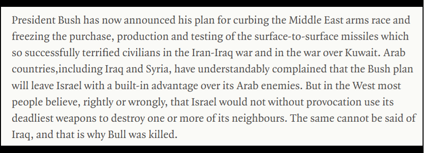 Bull also appears to have helped Iraq in related long-range weapons work beyond the supergun itself. This made him even more dangerous in the eyes of Iraq’s enemies. To Israel in particular, Bull would not have looked like a harmless eccentric scientist. He would have looked like a technical enabler helping one of Israel’s most hostile regional enemies build strategic strike capacity.